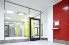 Die Farben Rot, Orange und Gelb kennzeichnen in der neuen Sterilfabrik der hameln pharma sowohl die unterschiedlichen Reinraumklassen als auch die Übergänge zwischen diesen Reinraumklassen. So sind die Türblätter der Personalschleusen jeweils in der Farbe der Reinraumklasse gehalten, die sich direkt hinter der Tür verbirgt.